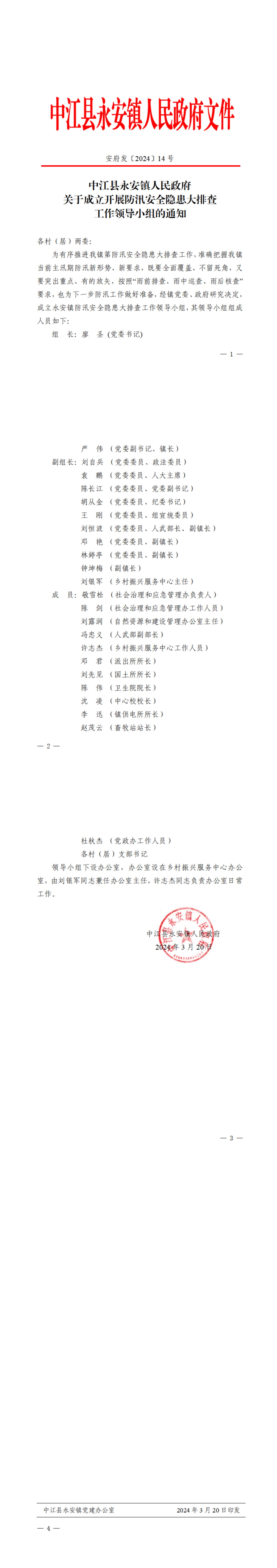中江县 永安镇 人民政府 成立 开展 防汛 安全隐患 大排查 领导小组 的通知