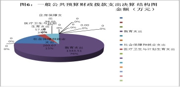 2018年一般公共预算财政拨款支出1759.91万元,主要用于以下方面:一般公共服务支出0万元,占0%;教育支出1343.51万元,占76.34%;社会保障和就业支出260.67万元,占14.82%;医疗卫生支出57.68万元,占3.28%;住房保障支出98.05万元,占5.57%;(详见图6:一般公共预算财政拨款支出决算结构图)