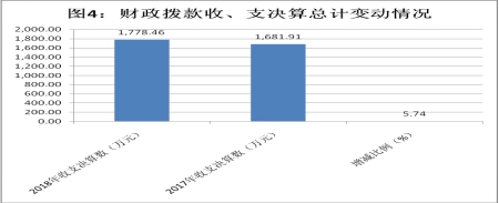 2018 年财政拨款收、支总计 1778.46 万元。与 2017 年1681.91 万元相比,财政拨款收、支总计各增加96.55万元,增长5.74 %。主要变动原因是工资调标等。(详见图4:财政拨款收、支决算总计变动情况)