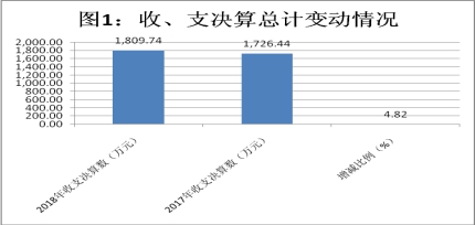 2018 年度收、支总计 1809.74 万元。与 2017 年 1726.44万元相比,收、支总计各增加83.3 万元,增长4.82 %。主要变动原因是工资调标等。详见图1
