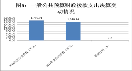 2018 年一般公共预算财政拨款支出 1759.91万元,占本年支出合计1791.2万元的 98.25%。与 2017 年1640.14 万元相比,一般公共预算财政拨款支出增加119.77 万元,增长7.3 %。主要变动原因是工资调标等。(详见图5:一般公共预算财政拨款支出决算变动情况)